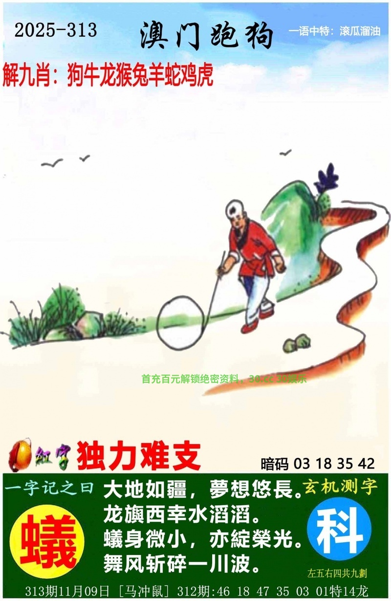 金銀財足:大地如疆,夢想悠長。龙旟西幸水滔滔。蟻身微小,亦綻榮光。舞风斩碎一川波。玄機測字:《科》